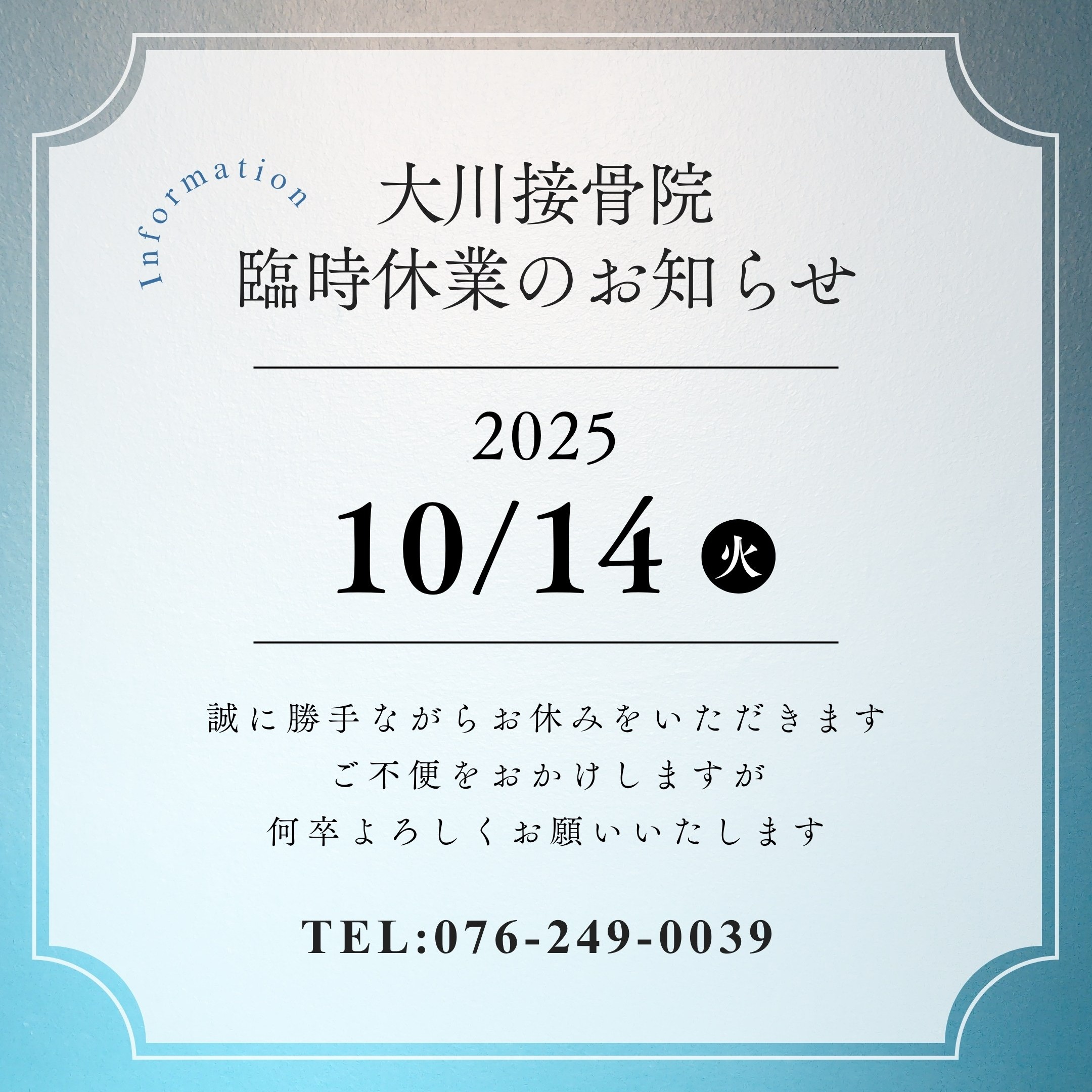 お休み等のご案内は、当サイト(大川接骨院公式)及び、Facebookページ、Instagramで発信しております。