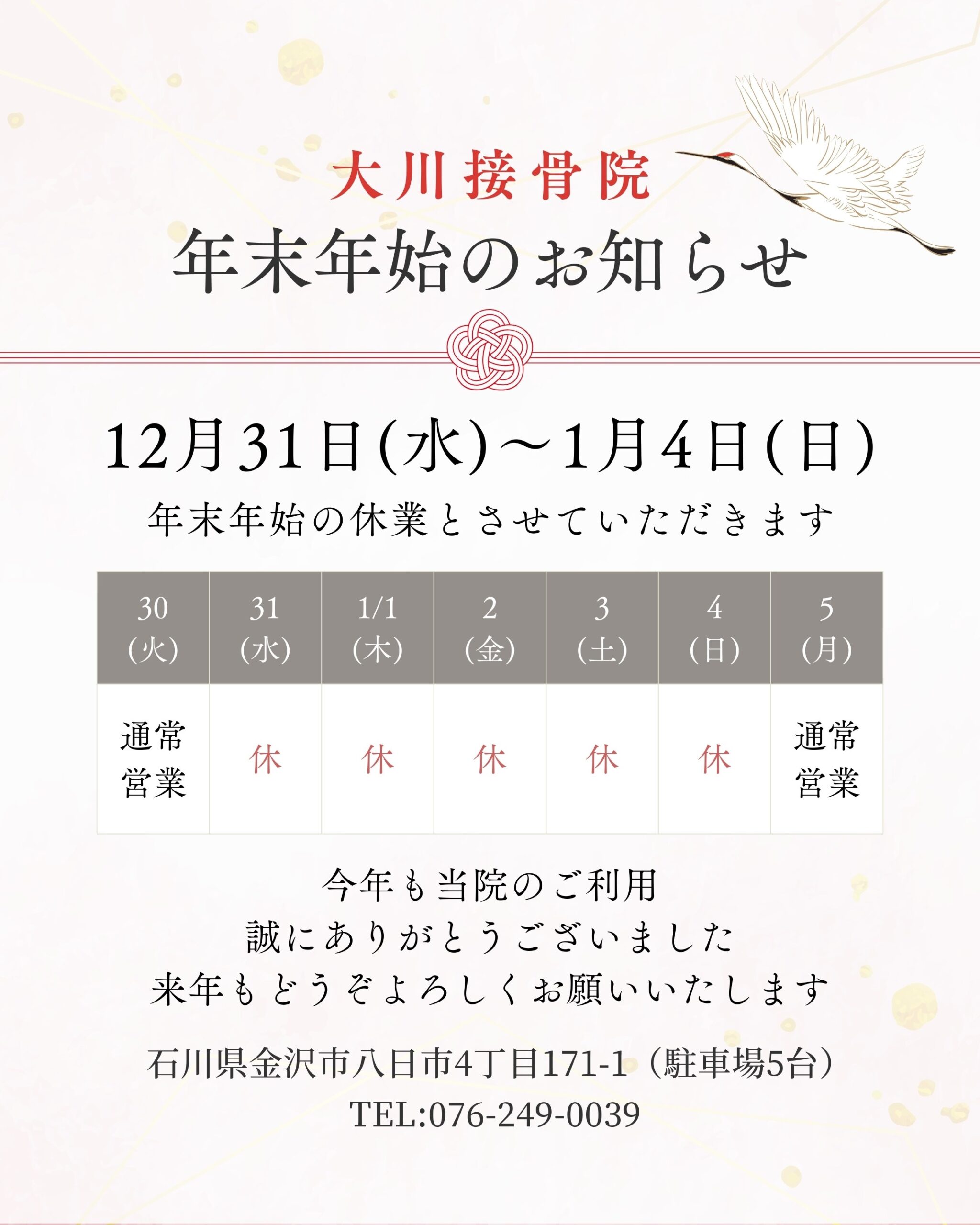 大川接骨院は、年末12月30日(火)まで通常営業、